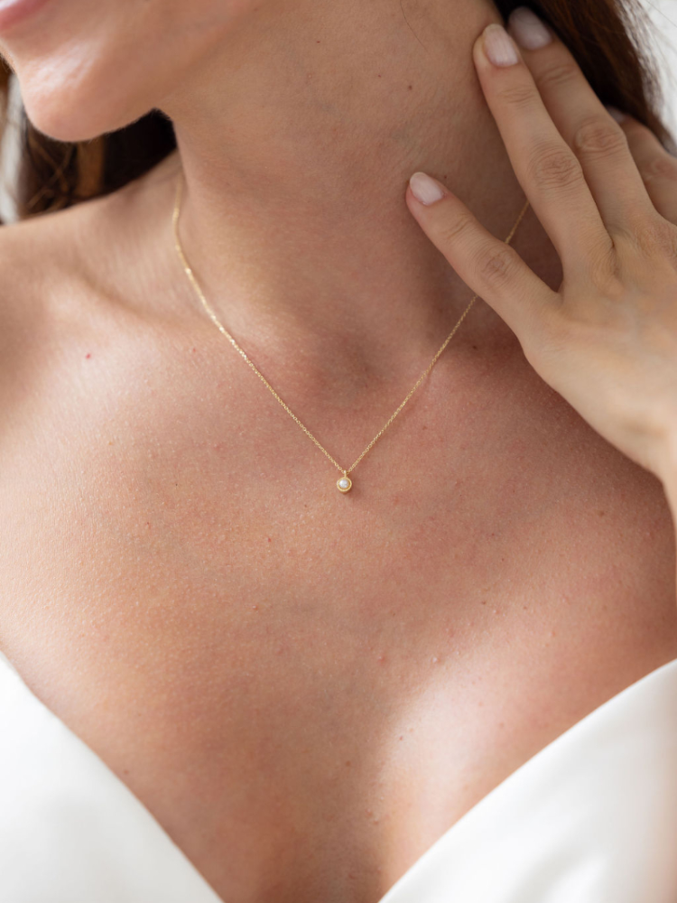 Collana in argento 925 placcato oro con pendente rotondo che racchiude una perla e zirconi. Aggiunge un accento delicato e raffinato al décolleté.