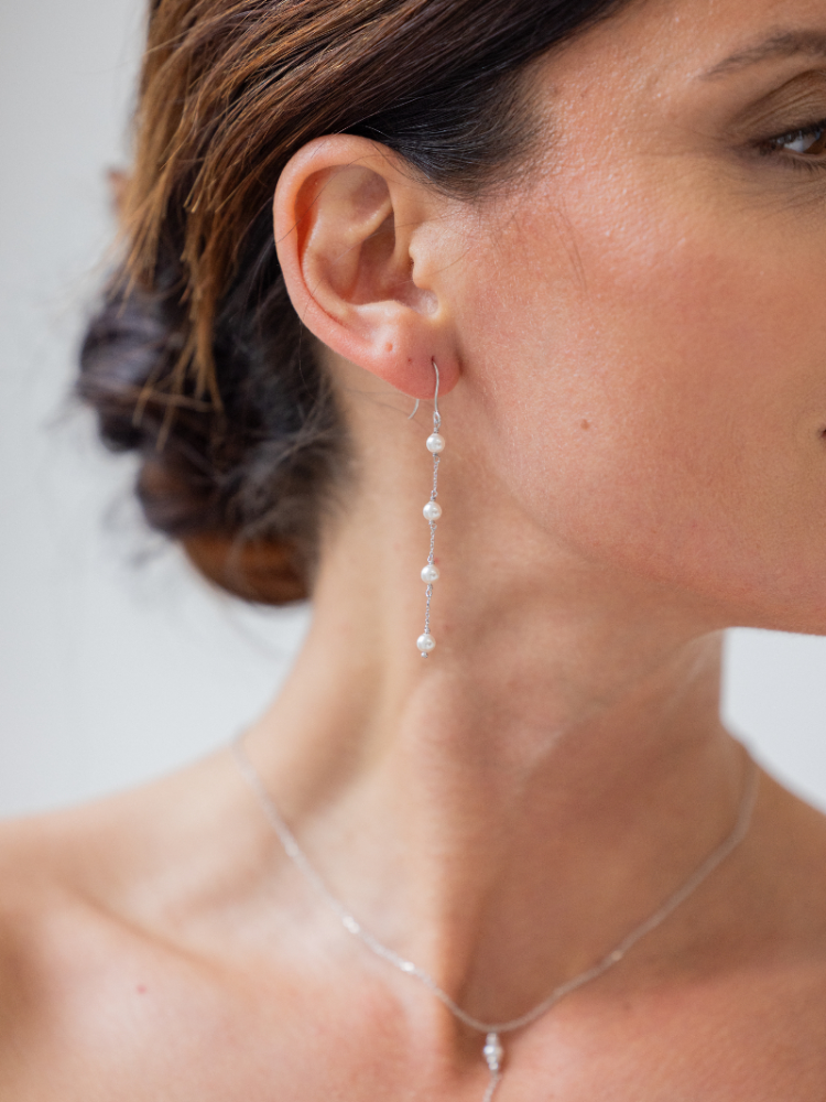 Orecchini lunghi in argento 925 con finitura rodiata e quattro perle pendenti in linea. Il movimento delicato crea un look morbido e romantico, perfetto per stili nuziali classici.