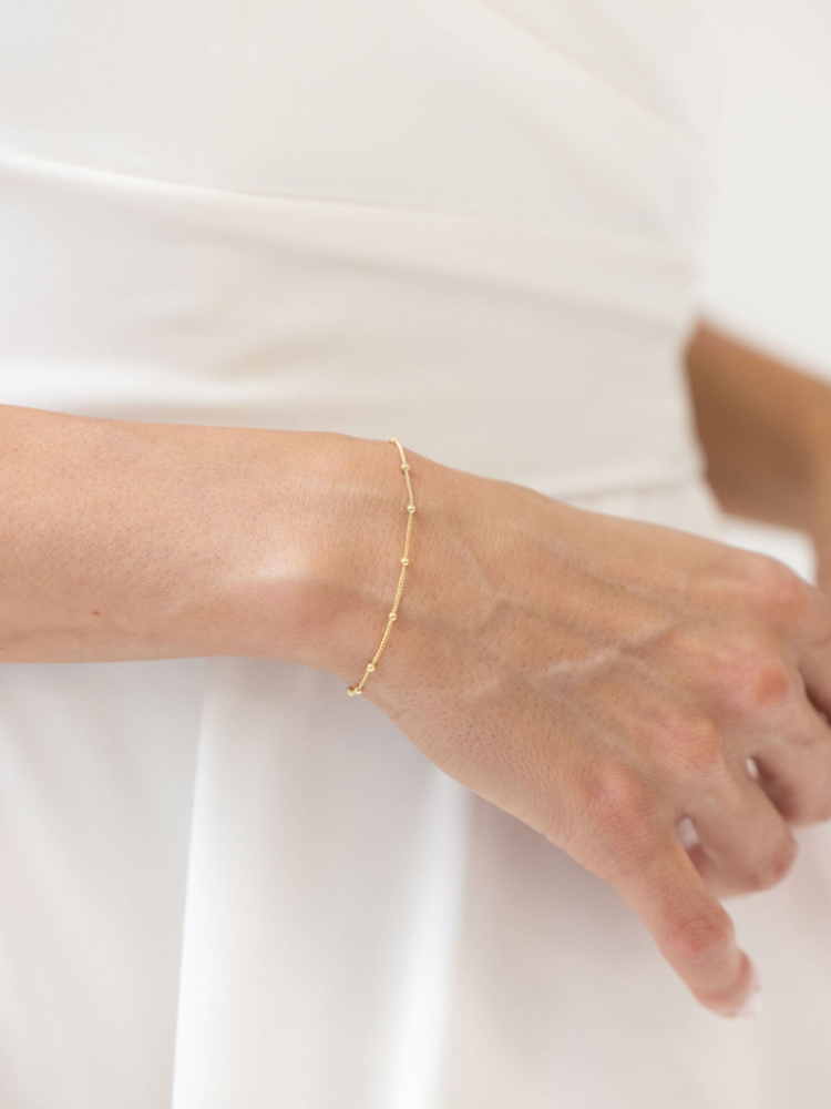 Bracciale in argento 925 placcato oro con piccole sfere che brillano delicatamente sul polso. Design moderno e raffinato con catenina di estensione per una vestibilità confortevole. Perfetto per matrimoni e occasioni speciali.