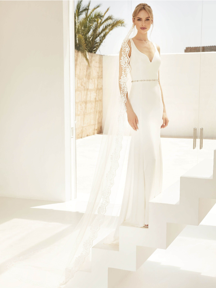 Questo elegante velo di Bianco Evento completerà il vostro look da sposa. Questo velo a strato singolo è realizzato in tulle diamantato con un bordo di pizzo con perline di cristallo. Viene fornito con un pettine che facilita il fissaggio del velo ai capelli.