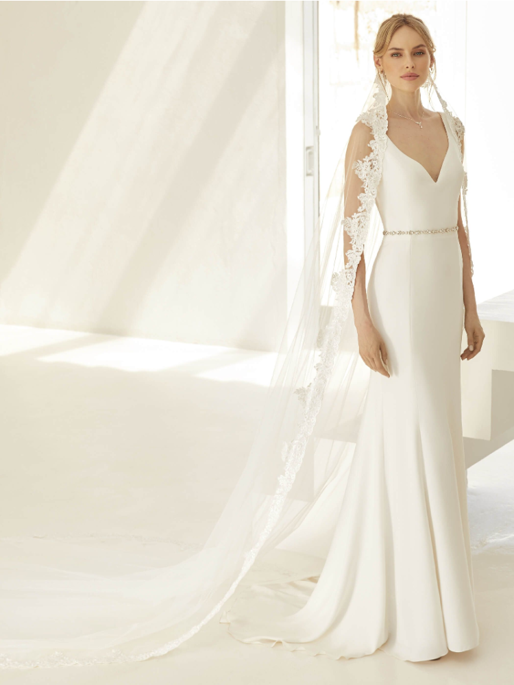 Questo elegante velo di Bianco Evento completerà il vostro look da sposa. Questo velo a strato singolo è realizzato in tulle diamantato con bordi in pizzo con perline di cristallo. Viene fornito con un pettine per facilitare il fissaggio del velo ai capelli.