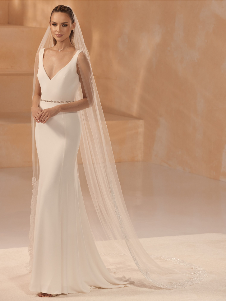 Questo elegante velo di Bianco Evento completerà il vostro look da sposa. Questo velo a strato singolo è realizzato in morbido tulle con un bordo tagliato in alto e un bordo in pizzo in basso. Viene fornito con un pettine che facilita il posizionamento del velo tra i capelli.