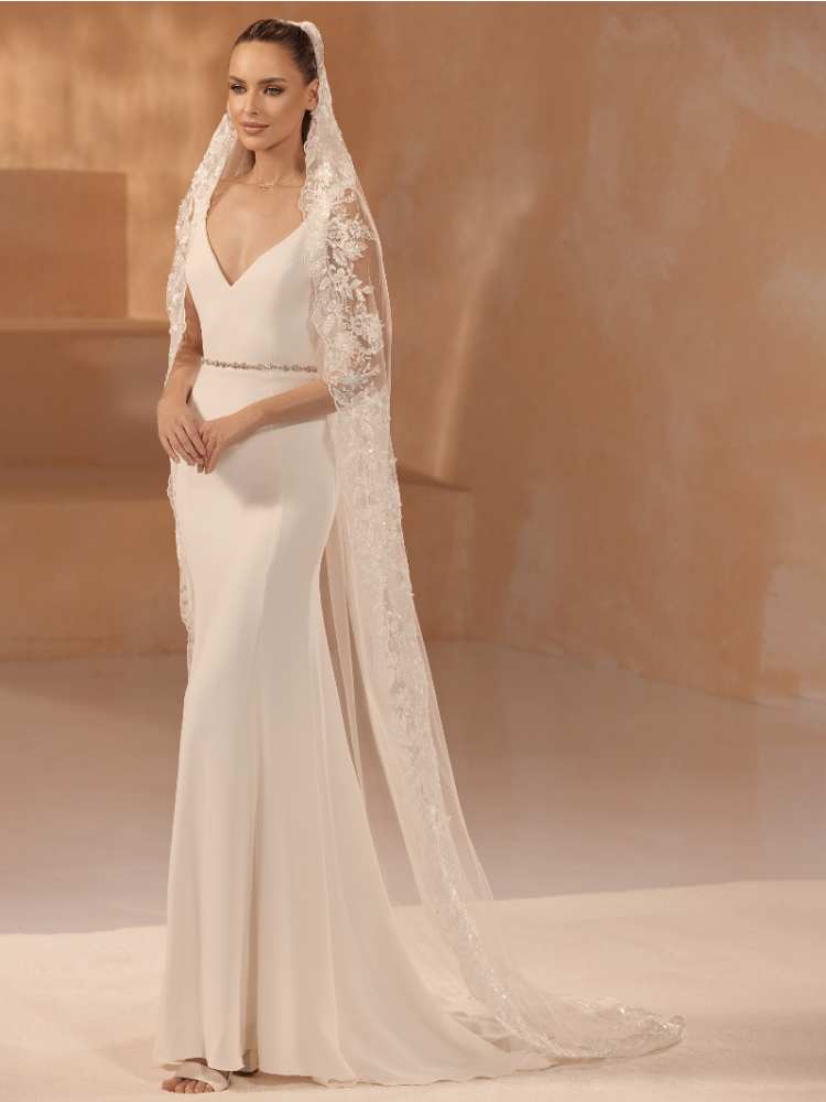 Questo elegante velo di Bianco Evento completerà il vostro look da sposa. Questo velo a strato singolo è realizzato in morbido tulle con bordi in pizzo. Viene fornito con un pettine per facilitare il posizionamento del velo tra i capelli.