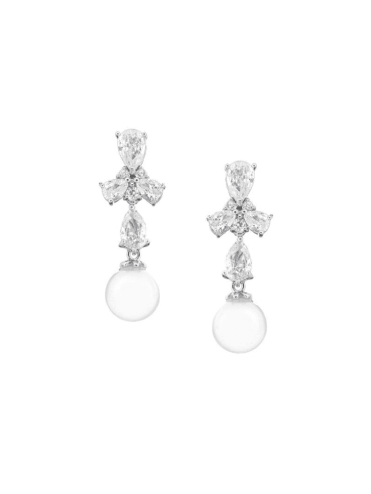 Questi preziosi orecchini in argento sono composti da un'impressionante combinazione di brillanti pietre in zirconia cubica. Le perle color avorio degli orecchini li rendono molto moderni e chic. Saranno fantastici abbinati al tuo abito da sposa. Gli orecchini placcati in rodio splenderanno nel tuo giorno speciale e daranno il tocco finale al tuo outfit da sposa. Gli orecchini hanno una lunghezza di 4,8 cm.