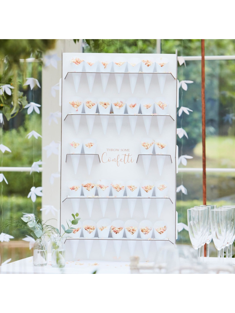 La parete è realizzata in cartone bianco e si monta facilmente da soli. Il cartello riporta la scritta Throw some confetti (getta i coriandoli) in lettere d'oro rosa.