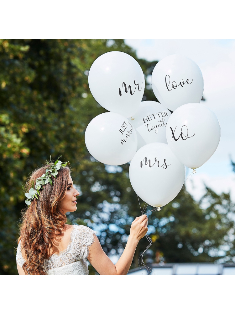 I palloncini bianchi presentano i testi: Mr, Mrs, Love, XO, Just married e Better Together. La confezione contiene un totale di 6 pezzi, che possono essere riempiti con elio o aria fino a una dimensione massima di 30 cm.