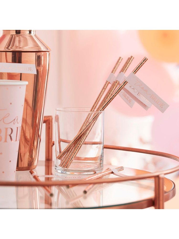 Fiaschettine di paglia con il motto 'Team Bride' in rosa dorato, il modo perfetto per gustare cocktail in ogni addio al nubilato! Eleganti, colorate e pratiche, queste cannucce aggiungono un tocco festoso e chic alla tua celebrazione, rendendo ogni brindisi speciale e memorabile.