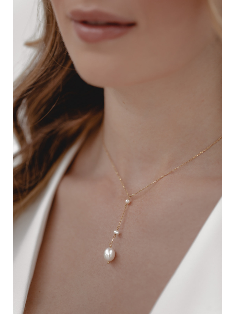 Heavenly elegant and modern at the same time: delicate necklace with two small and one larger freshwater pearls – the narrow tapering shape of the necklace is particularly suitable for bridal gowns with a V-neckline.