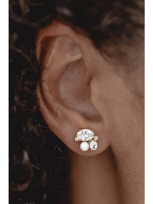Questi straordinari orecchini a perno combinano il meglio di due mondi: perle classiche e cristalli moderni, materiali glamour e un design stravagante. L'attenzione si concentra su due cristalli ovali più grandi e su una classica perla d'acqua dolce, affiancata da due piccoli cristalli rotondi.