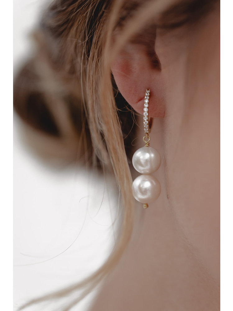 Questa lussuosa rivisitazione dell'orecchino di perle affascina immediatamente con due perle d'acqua dolce di alta qualità incastonate su una creola ornata da piccoli cristalli tutt'intorno.