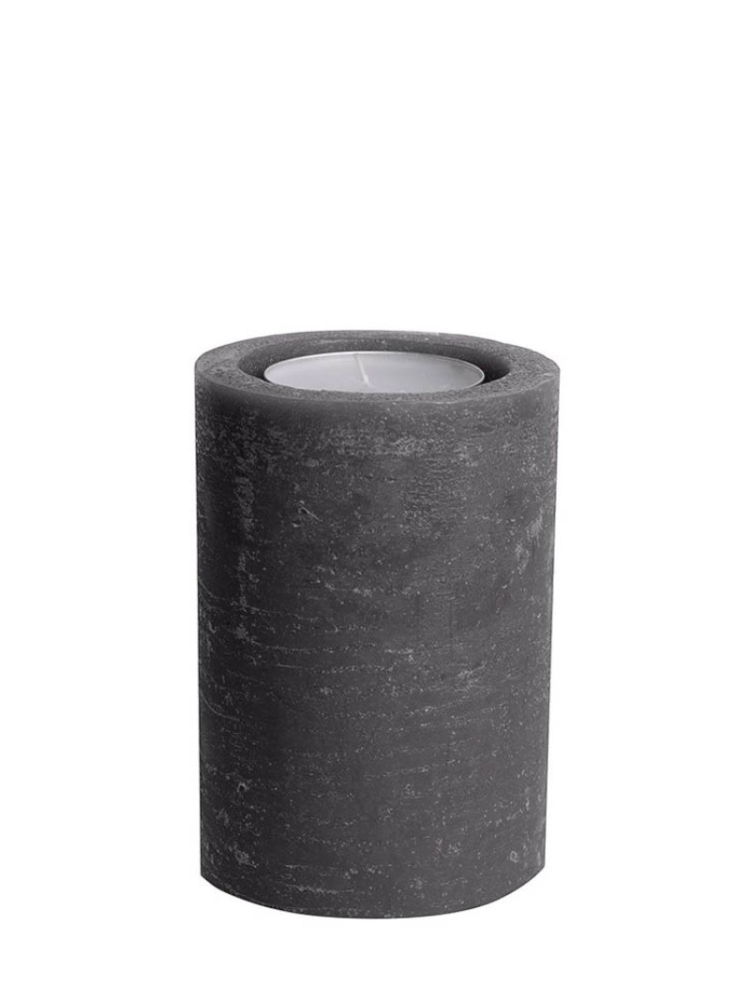 Realizzato in cera dall'aspetto paraffina in una delicata sfumatura di grigio, misura Ø10 x 14 cm (Ø3.9 x 5.5 in) e custodisce un grande tealight mantenendo l'illusione di una candela a colonna; la base solida tiene la fiamma centrata in tutta sicurezza.