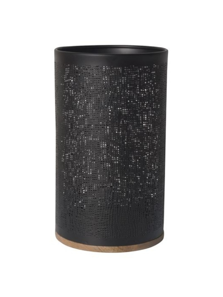 Realizzata in legno caldo con finitura nera opaca, la lanterna Lou presenta un motivo traforato che diffonde la luce della candela con delicatezza. Misura circa 15 x 25 cm (15,4 x 26,3 cm) e si presta come elemento portatile per tavoli, camini o percorsi in giardino.