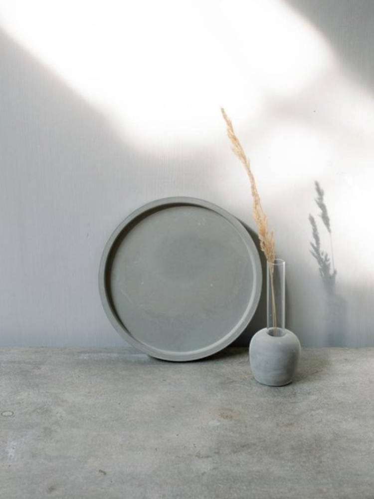 Scopri Leeff 18377 Tray Tigo S, un vassoio in cemento grigio dal design essenziale, pensato per valorizzare vasi, candele e piccoli tesori.