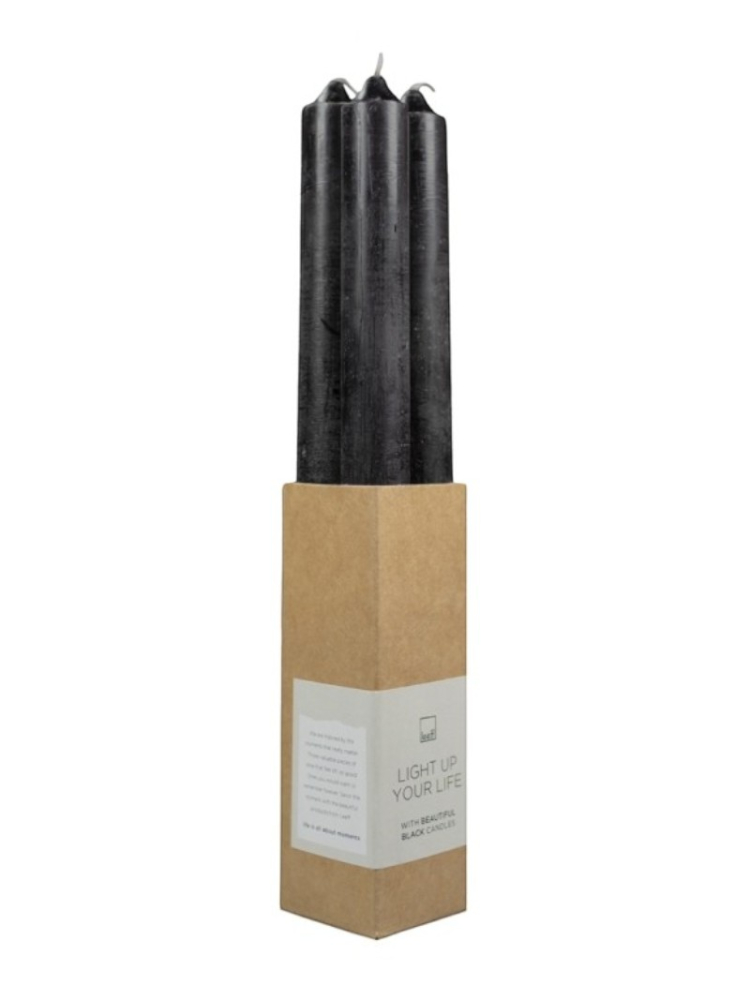 Realizzate in pura cera, ogni candela misura 25 x 2 cm e offre circa 10 ore di luce calda; il set da quattro arriva in una confezione curata che riporta la scritta "Light up your life with beautiful black candles", perfette per candelabri o per portacandele sottili.