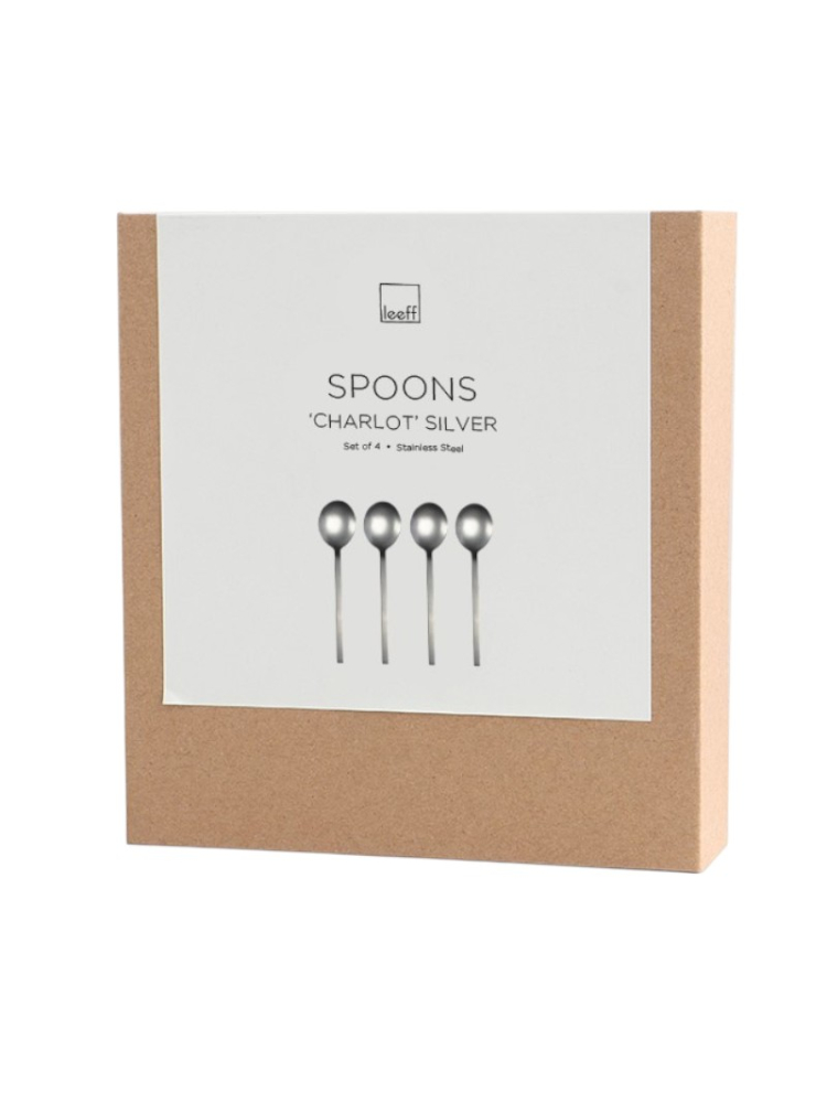 Scopri i cucchiai Charlot Leeff 18468: un set elegante di quattro cucchiai in acciaio inossidabile con finitura argento vintage.
