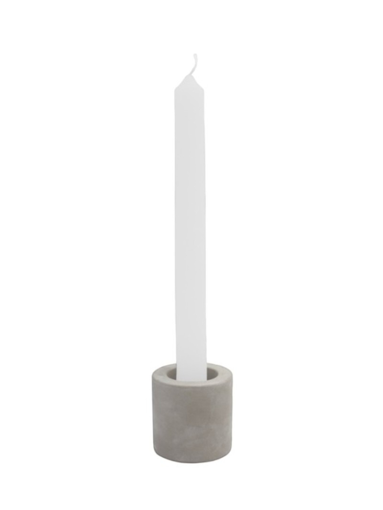 La base è in calcestruzzo levigato dal tenue colore bianco, mentre le sottili candele bianche sono disposte con cura; ogni candela misura circa 5,5 x 5,6 cm, offrendo una silhouette essenziale e perfetta per un’illuminazione intima durante momenti cerimoniali.