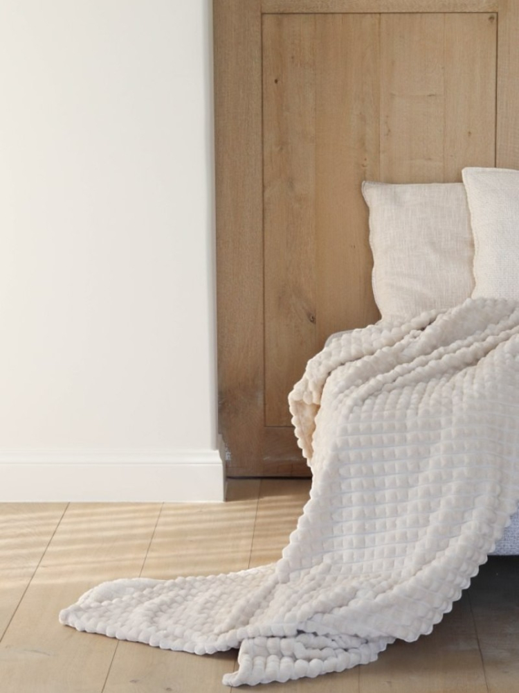 Un soffio di calore condiviso: il plaid Paula in fleece naturale invita alla vicinanza e al comfort discreto, ideale per neosposi e ospiti.