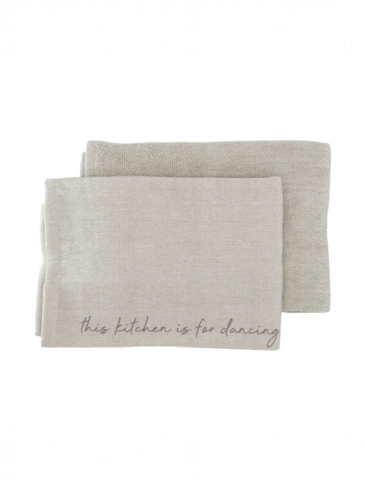 In cotone 100% color naturale, il set comprende due pezzi 50 x 70 cm — uno con la stampa "This kitchen is for dancing" — perfetti per asciugare, abbellire o confezionare piccoli regali, con una trama che invita a colazioni in compagnia e nuovi inizi gioiosi.