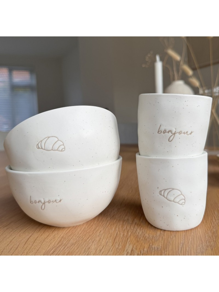 - Una tazza con delicata illustrazione del croissant e una con la scritta Bonjour