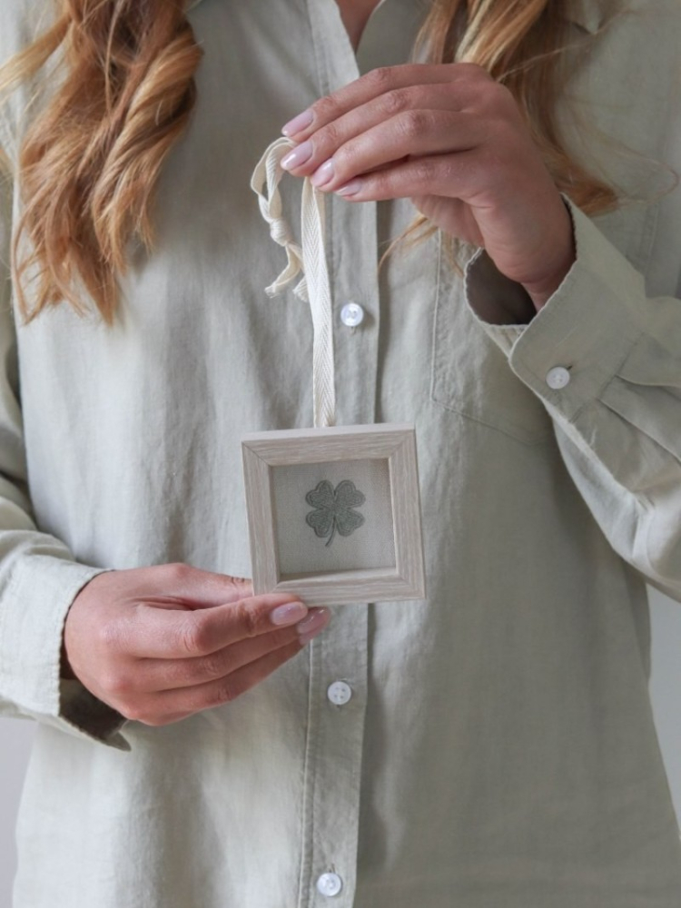 - Lino con quadrifoglio ricamato: simbolo di fortuna da conservare nel tempo.