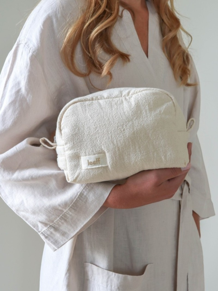 Una trousse da toilette in cotone biologico 100%, dal colore beige e dallo stile naturale. Firmata Leeff, รจ una splendida idea regalo: compagna perfetta per le fughe del fine settimana e meravigliosa da usare ogni giorno. Disponibile in due tonalitร , per un tocco discreto ed elegante.