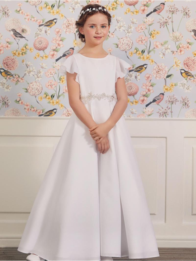 Questo abito di comunione/ damigella d'onore di LILLY è semplice ma affascinante. L'abito presenta adorabili maniche corte e meravigliosi dettagli di perle al centro, a forma di piccole foglie. Il suo design elegante e comodo lo rende perfetto per ogni occasione speciale.