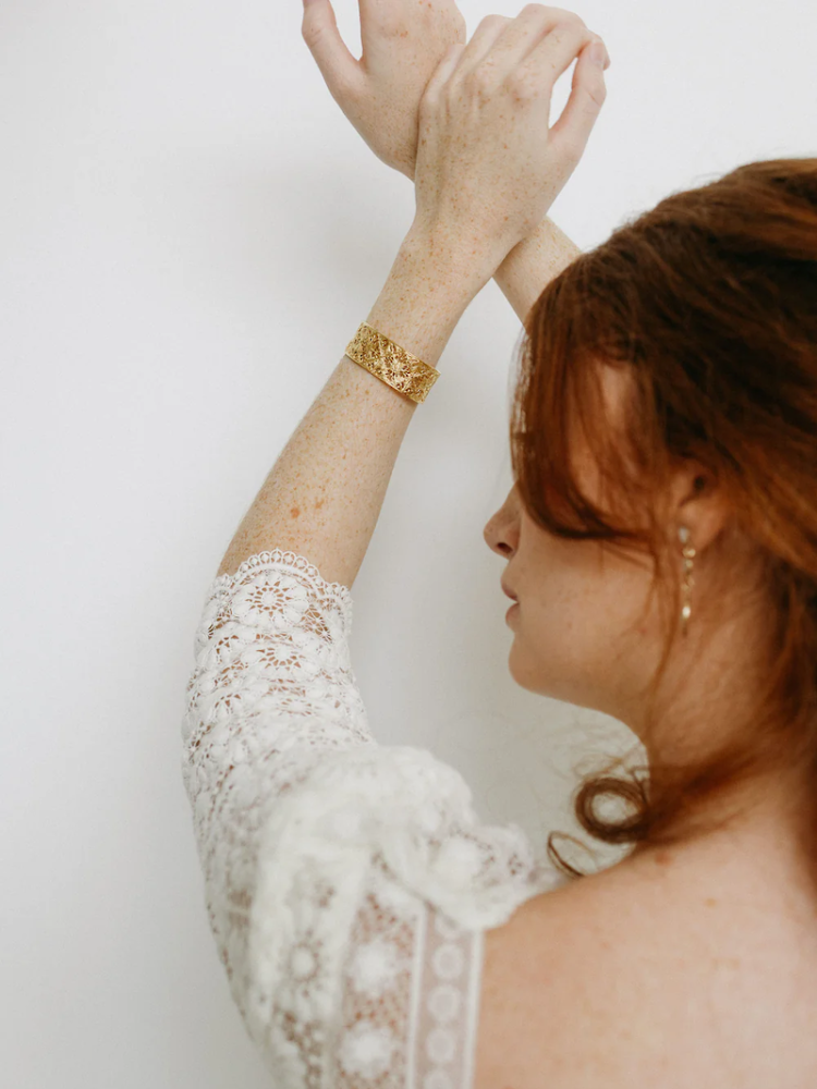 Il bracciale ottomano di Lizeron è un elemento in ottone placcato oro, caratterizzato da un design intricato realizzato in Francia. È elegante e senza tempo, perfetto per aggiungere un tocco di classe a qualsiasi outfit.
