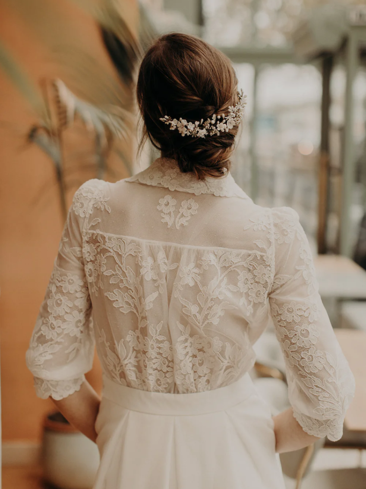 Il pettine per capelli Perrine di Lizeron è un accessorio artigianale splendidamente realizzato che aggiunge un tocco romantico a qualsiasi acconciatura. Con una lunghezza di circa 20 cm, presenta una generosa disposizione di delicati elementi in porcellana, tutti meticolosamente realizzati a mano. Progettato per essere fissato con delle forcine, il pettine Perrine si integra perfettamente in diversi stili di acconciatura, esaltando il tuo look con il suo design intricato ed elegante. Una leggera spruzzata di lacca per capelli può valorizzare la lucentezza perlacea della porcellana, aggiungendo un tocco di brillantezza; tuttavia, se preferisci mantenere il suo aspetto opaco originale, è meglio evitare l'uso della lacca. Eleva la tua acconciatura con il pettine per capelli Perrine, un pezzo senza tempo che unisce fascino classico ed eleganza moderna.