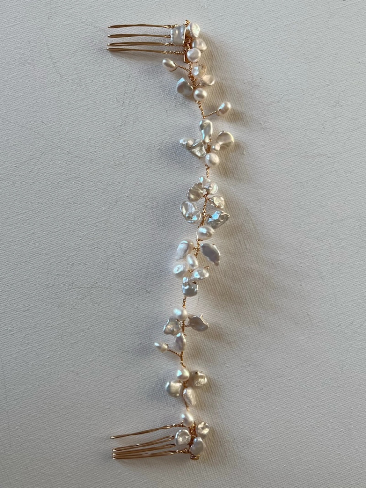 La Nova Coroncina Oro di Sally Jane Bridal è un accessorio per capelli splendidamente realizzato a mano e flessibile, progettato per conferire un'eleganza morbida e naturale a qualsiasi stile nuziale. Con perle grezze uniche e perle d'acqua dolce brillanti su un sottile filo dorato, questa tiara di 18 cm crea un look romantico e organico. Il suo design leggero e malleabile ne facilita l'inserimento in trecce, chignon bassi o mezze acconciature. Perfetta per le spose che cercano un tocco minimalista, bohemien o romantico.