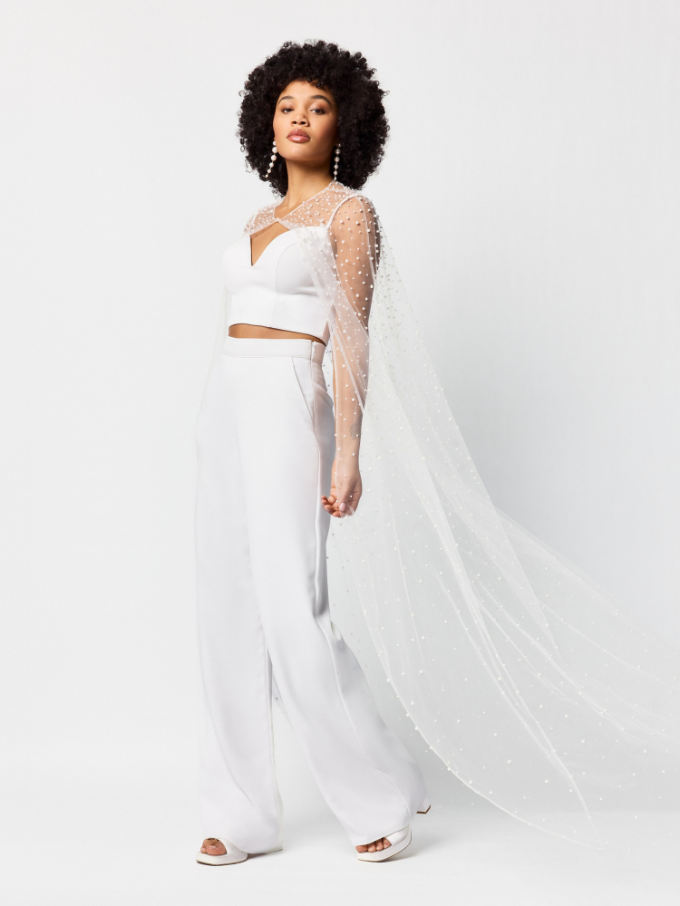 Il Poirier C-75100 Cape è un mantello lungo 200 cm in tulle avorio, decorato con perle e rifinito con una chiusura a bottone di perla. È un'alternativa elegante e moderna al velo. Un accessorio raffinato, perfetto per aggiungere un tocco di classe al tuo look da sposa.
