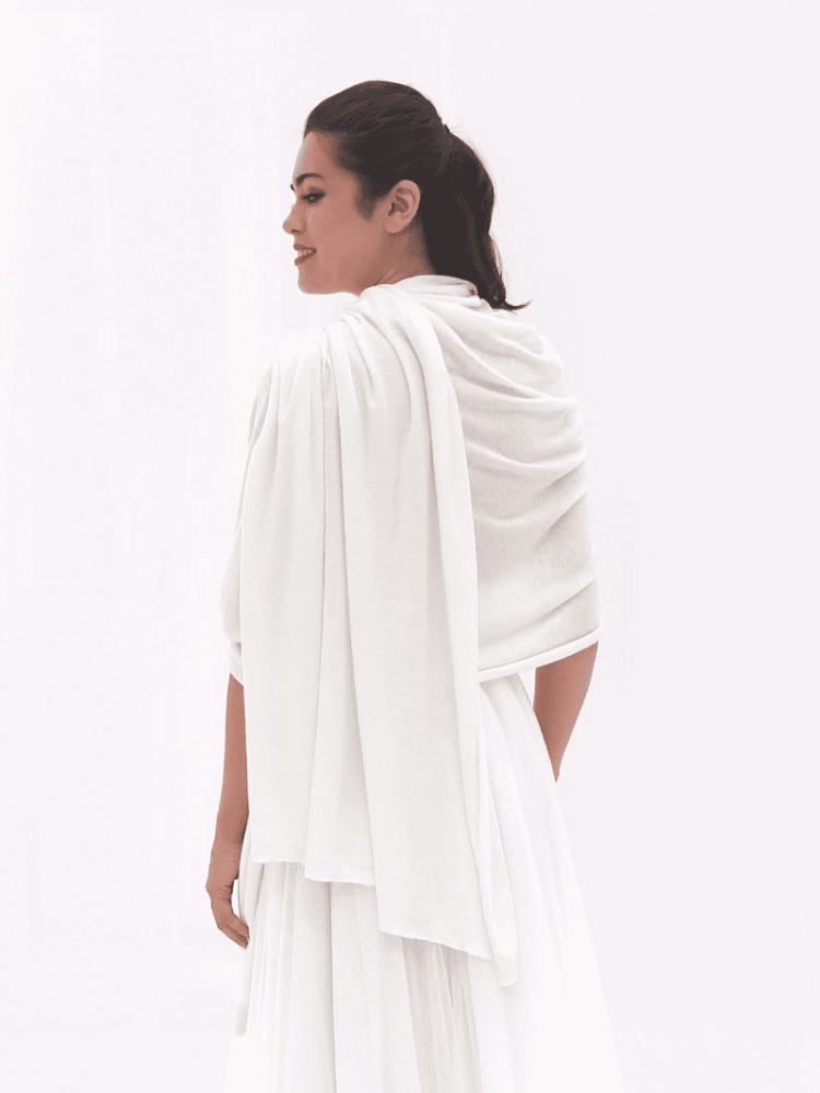 La stola color avorio S189 è esattamente ciò che state cercando! Questa stola è realizzata in un tessuto composito composto da 16% lana, 20% acrilico, 20% nylon e 44% poliestere. Le misure di questa stola sono 240 cm x 80 cm (94,4 x 31,5 pollici). Il colore neutro e il design rendono questa sciarpa l'accessorio da matrimonio per eccellenza.