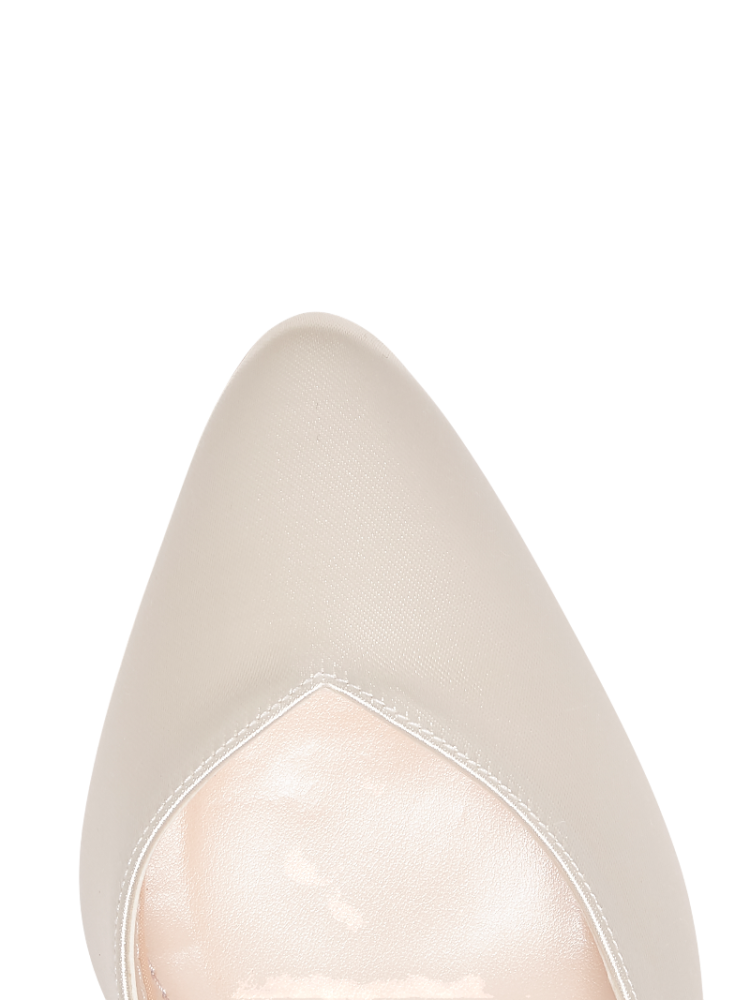 Le scarpe da sposa Rainbow Club Eve sono pensate per chi ama un bridal look moderno e raffinato, con un tocco di altezza. Realizzate in prezioso raso avorio, hanno punta affusolata, delicato cinturino alla caviglia e un tacco a blocco da 8,5 cm per una stabilità sicura.