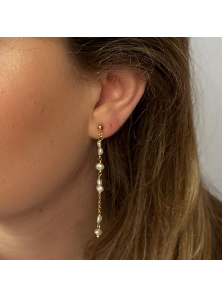 | Istruzioni per la cura | Stylish gold-plated earrings over brass, delicately finished with sparkling freshwater pearls. These long Mila earrings exude elegance and are perfect for special occasions or as a subtle statement piece. Also available in silver. |